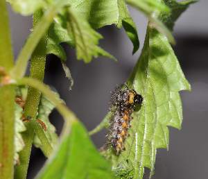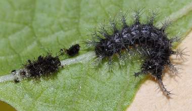 | サカハチチョウは、大阪府でも静岡県でも低山地に広く見られる小型のタテハチョウです。春型と夏型で大きく模様が異なるのが特徴的です。夏型の模様が、漢字の「八」を逆さにしたように見えることからこの名があります。晩春の里山の蝶の代表的な一種です。比較的普通種に分類されますが、大阪市や静岡市南部日本平では見ることができません。そのためにこれまで、幼生期を観察することができませんでした。2010年9月に宮崎県を訪れたところ、車からふっと黒いものがコアカソに見え、すぐにこの蝶の幼虫と分かったので、採取して飼育しました。その後、静岡市中部で採集した母蝶に産ませた卵を飼育しました。 |
