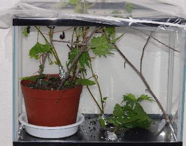 (参考) 前蛹と飼育の様子 2011年6月5日 静岡市葵区中部 産 静岡市駿河区 飼育 コアカソの小さい鉢植えで2匹を飼うことはできないので、他の鉢植えからのコアカソの枝を入れています。蛹化場所にと枯れ枝も刺してあります。しかし結局、前蛹がぶら下がっているのはコアカソの切り枝でした。これは萎れてしまうので、蛹や羽化の観察には最悪の場所で、ちょっと悔しいです。もう一匹は刺した木の枯れ枝で蛹化してくれました。 トップページへ |