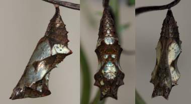 (参考) サカハチチョウの蛹(18.5mm) 2011年6月9日 静岡市葵区中部 産 静岡市駿河区 飼育 6月6日には蛹化していました。そのときには反射する部分はありませんでした。しかし翌日には、多くの部分が鈍く輝いていました。宮崎産の幼虫を飼育したときには、輝いていたのは突起の部分だけでしたので、遺伝や蛹化場所の状況で変化するのでしょう。もう1匹の方も模様は微妙に異なります。 トップページへ |