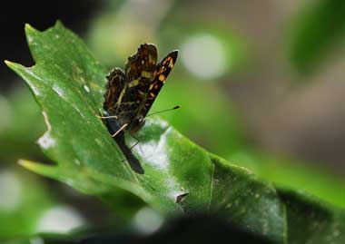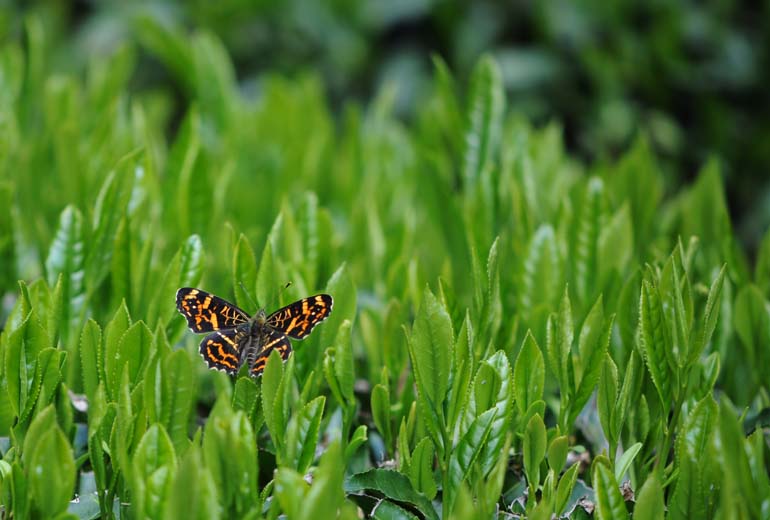 (参考) サカハチチョウの休息 2015年4月26日 静岡市葵区中部(南部より) この地は何度も通っていますが、初めてサカハチチョウを見ることができました。コアカソの多い谷筋なのでいるはずだと思いながらも今まで見ることができなかったのです。比較的暗い谷筋の舗装道路を歩いていると褐色の蝶が飛びました。最初はテングチョウかもと思いましたが、サカハチチョウが葉上に止まってくれたので大変うれしかったです。しばらく見つかりませんでしたが、これから新茶になるであろうきれいなチャノキの芽の中にとまってくれて新緑とオレンジ色のコントラストが大変きれいでした。 トップページへ |
