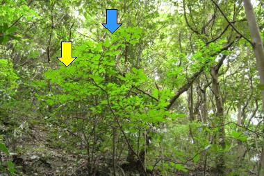 (参考) スミナガシの卵と環境(アワブキ) 2008年5月31日 大阪府 食樹であるアワブキ(樹高2m)をやっと見つけ、そして卵と幼虫も見つかりました。黄色矢印あたりに卵が、青矢印あたりに1齢幼虫がいました。卵の筋は18本あります。卵は成葉の裏面中央付近にありました。なお、アオバセセリの卵は比較的若い葉裏面の葉柄近くの葉縁近くにありました。共に白くて筋のある卵で見た目分かりにくいですが場所と形で区別できます。アワブキは滅多にないですが、流水の多いところに生えているようです。 トップページへ |