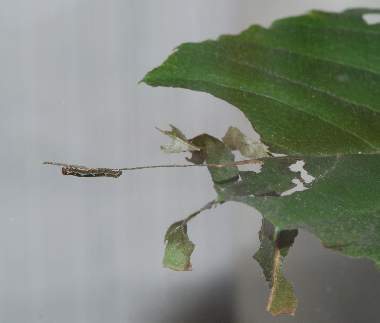 (参考) 葉の先端を糸で固める幼虫(1齢) 2008年6月4日 上21:47、下21:53 大阪府 産 大阪市淀川区 飼育 先端に達するとやはり休むことなく葉に糸を何往復も吐いて固めます。 トップページへ |