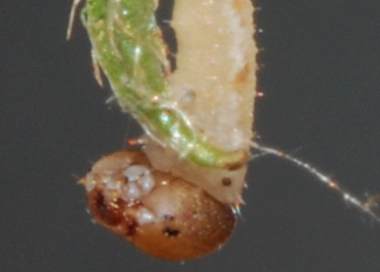 (参考) 造形物を作る幼虫(1齢、3mm) 2008年6月4日 22:31 大阪府 産 大阪市淀川区 飼育 塔を作り終わった段階で、しばらく塔に止まっていました。油断している間に、最初の造形物を作ってしまいました。造形物や幼虫の頭に付いている葉片は0.2mmぐらいです。 トップページへ |