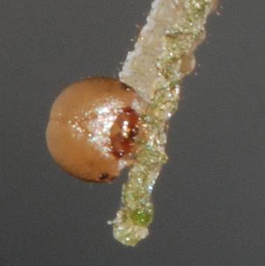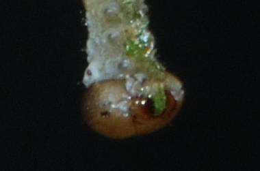 (参考) 卵(孵化直前) 2008年6月4日07:46am 大阪府 この日の日中に孵化しました。幼虫の頭が見えています。 トップページへ |