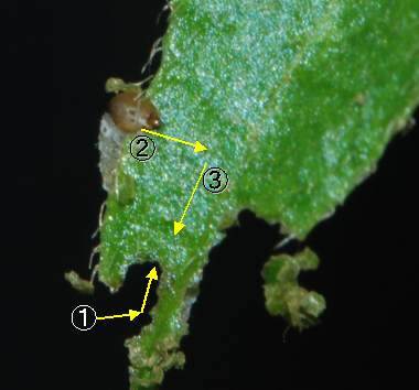 (参考) 造形物を作る幼虫(1齢、3mm) 2008年6月4日 上22:38、中22:38、下22:42 大阪府 産 大阪市淀川区 飼育 2つ目の造形物を左側に作っています。丸数字の順番で切れ目を入れていますが、単に切れ目を入れるのではなく0.2mm程度の葉片をかじり取って作っています。葉片は2枚目の写真のように、近くにこすりつけています。それがたまたま頭にくっついたようです。また、丸数字2と3の間に、造形物となる葉を、葉の本体と糸で結びつけてました(3枚目の矢印で糸を示す)。 トップページへ |