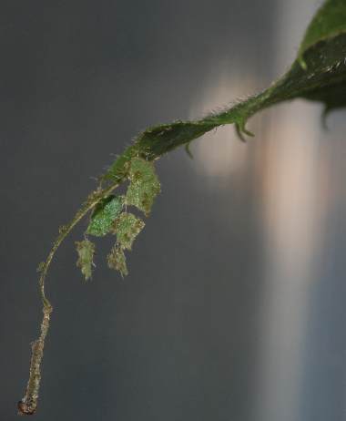 (参考) 造形物を作る幼虫(1齢、3mm) 2008年6月5日 上00:12am、下00:12 大阪府 産 大阪市淀川区 飼育 右左右左と葉を交互に切り取ってぶら下げていき、5つ目を作っているところです。下写真は裏から見たところです。 トップページへ |