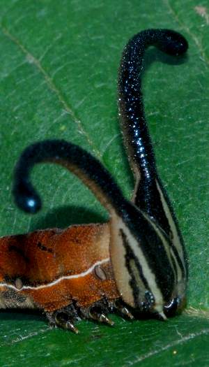 (参考) 幼虫(5齢) 2008年6月11日08:00am 大阪府 産 大阪市淀川区 飼育 かなり摂食しています。頭部のユニークさもさることながら、尾部もユニークな形をしています。図鑑で見てもどうなっているのか分からなかったのですが、これでようやく謎が解けました。キツネの顔のようにも見えます。尾端は1本、その手前に2本突起があります。なぜこんな色なのかも不思議です。 トップページへ |