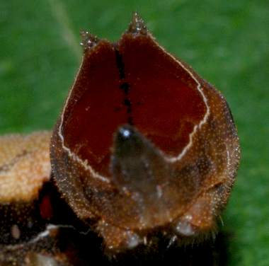 (参考) 幼虫と巣(1齢、6.5mm) 2008年5月31日 大阪府 生息現地および 大阪市淀川区 飼育 枝を眼前に近づけて卵を探そうとしたら、葉の様子が変ですぐにそれと分かりました。図鑑や他のHPでよく見るカーテン上の葉片が葉先に付いていて、その根元に幼虫がいました。葉片の先には塔(葉を噛み砕いたものを重ねるらしい)が伸びています。 トップページへ |