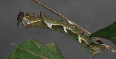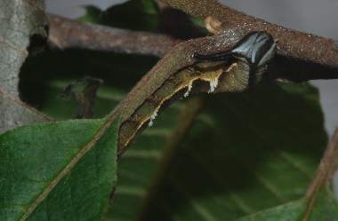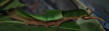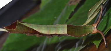 (参考) 幼虫(2齢、ヤマビワ) 2010年9月12日 宮崎県日南市 少し驚かすと体を反り返らせます。かなり固い葉のように思えますが、平気です。 トップページへ |