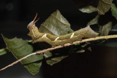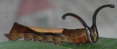 (参考) 幼虫の静止と顔(3齢) 2008年6月11日 大阪府 産 大阪市淀川区 飼育 いわゆるしゃちほこ型の姿勢です。驚かす(ちょっとした振動程度ですが)とこうなります。3齢になり、頭部の突起も少し長くなりました。 トップページへ |