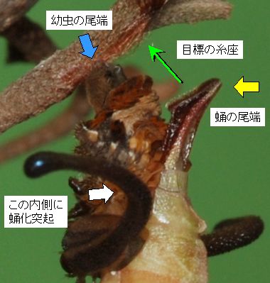 ![]() ↑脱いだ皮から蛹の尾端を引き出して糸座にこすりつけて引っかける直前 |