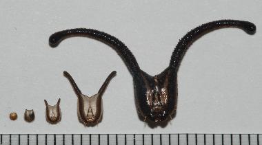(参考) スミナガシ幼虫の頭殻の齢数比較 大阪府 産 大阪市淀川区 飼育 齢数による頭部の比較をしてみました。1目盛り=1mmです。齢が進むにつれて、頭部突起がどんどん長くなることが分かります。ついでにイシガケチョウの頭殻とも比較してみました(縮尺は異なります)。 トップページへ |