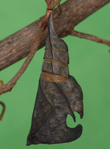 (参考) スミナガシの蛹 2008年6月23日 大阪府 産 大阪市淀川区 飼育 脱皮後数時間経てば、枯葉に完全に擬態した蛹が完成します。模様だけでなく、突起の形も非常にユニークなものです。なお、ステレオ写真は、他の個体のものが下方にあります。 トップページへ |
