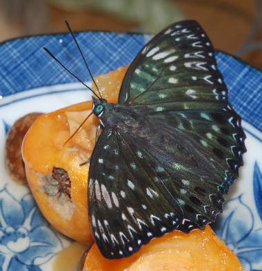 (参考) 吸汁するスミナガシ 2008年7月2日 兵庫県神戸市 産 大阪市淀川区 飼育 びわに梅酒を薄めたものをかけてやっています。近づけるとすぐに赤い口吻を伸ばして吸い始めます。 トップページへ |