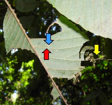 (参考) 卵と幼虫(1齢) 2008年8月10日 大阪府 2008年5月に飼育したスミナガシ卵を見つけたアワブキとは異なる木です。黄色矢印に1齢幼虫がいます。青矢印に卵の痕跡があり、おそらくこれが元の卵と思います。その隣の赤矢印の位置にも孵化していない卵があります(生死不明)。この葉は以前にも食べられたようで、母蝶から見て何か魅力があるのでしょう。 トップページへ |