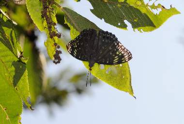 (参考) 吸汁と静止 2010年3月12日 沖縄県石垣島 小川が流れる山裾の小道脇です。2mぐらいの高さで樹液を吸っているように見えます。その後驚かしてしまい、近くの葉上で静止しました。スミナガシの口吻は特徴ある赤色です。 トップページへ |