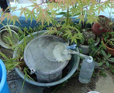 2017年8月20日 撮影 静岡市駿河区 母蝶採集 静岡市駿河区 飼育 いつものように、鉢植えの食草を洗濯網に入れ、今回はPETボトルのポカリスエットを水道水で3倍に薄めて与えています。7日目の様子です。産卵を確認した後の様子です。 トップページへ |