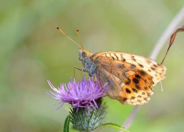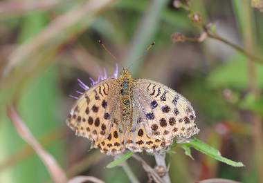 (参考) 吸蜜(♀、アザミ類) 2011年9月23日 長野県高地 母蝶1:この地に夏に訪れたときにはウラギンスジヒョウモンは見られませんでしたが、今回は蝶で見たのはウラギンスジヒョウモン♀とウラギンヒョウモン♀だけでした。気温は10℃ぐらいですが、陽が薄く射すと吸蜜に訪れるようです。しかし日が陰るとそのまま動かなくなるので手で捕まえて産卵に用いることにしました。 トップページへ |