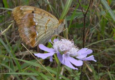 (参考) 吸蜜(♀、マツムシソウ) 2011年9月23日 長野県高原 母蝶2:高原の花の代表的存在であるマツムシソウで吸蜜してくれました。翅が尖った感じではなく、前翅先端部裏面が一様に暗い緑色でもなく、前翅裏面に白い紋もあるのでウラギンヒョウモンに間違いないでしょう。 トップページへ |
