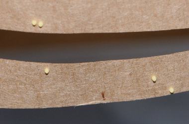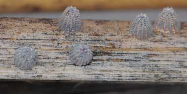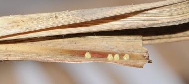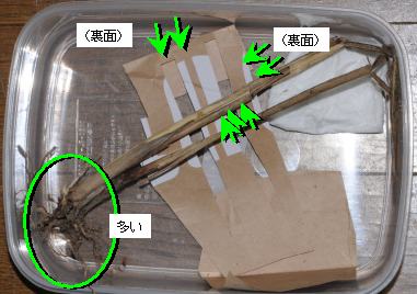(参考) 産卵後間もないウラギンスジヒョウモンの卵と産卵位置 2011年9月25日 静岡市駿河区 飼育 長野県高原 産 母蝶2の卵です。最初は紙だけを入れていたのですが5卵程度しか産みませんでした。現地状況に近くなるように、土が付いた枯れたススキを入れたところ、次々と産みました。