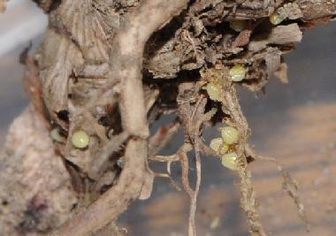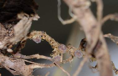 1日後の卵 2011年9月26日 静岡市駿河区 飼育 長野県高原 産 産卵からわずか1日経っただけですが、一見して卵が消えてしまいました。産みつけられた枯れ草の色に似た迷彩色になっているのです。 トップページへ