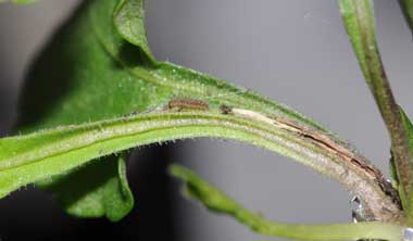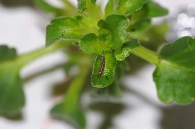 脱皮後まもない幼虫(2齢、2.8mm) 2012年2月7日 静岡市駿河区 飼育 長野県高原 産 個体1:葉上で静止しています。 トップページへ