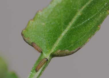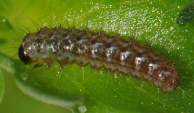 成長した幼虫(2齢、3.5mm) 2012年2月16日 静岡市駿河区 飼育 長野県高原 産 個体1:2齢は1齢に比べると黒っぽいです。3齢の頭部もできつつあるように見えます。糞が葉の上に点々と付いています。しかしその後全ての個体が死亡してしまいました。原因は不明です。残念です。 トップページへ |
