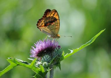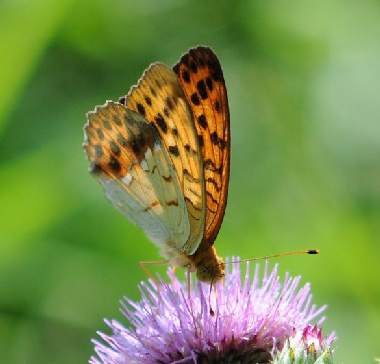 (参考) ウラギンスジヒョウモンの吸蜜(♂、アザミ類) 2012年8月4日 山梨県(富士山麓) 草の緑をバックにしてアザミにヒョウモンチョウ類という、いかにも夏の高原という感じの絵になりました。オオウラギンスジヒョウモンに比べて、前翅の出っ張りがほとんどありません。また、裏面も緑がかっていません。 トップページへ |