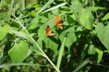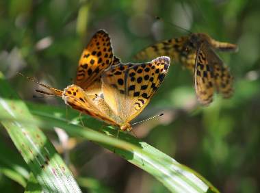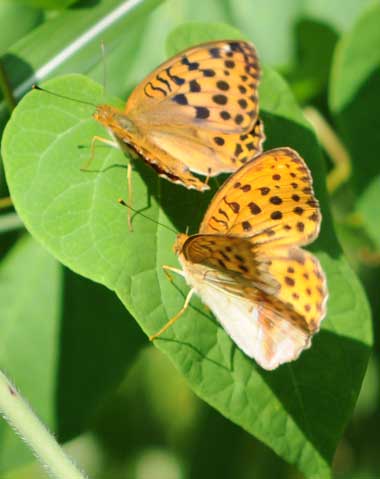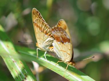 (参考) ウラギンスジヒョウモンの交尾(右♀) 2013年8月11日 長野県高原 この日は交尾をしているペアを2組み見ました。結構飛んで逃げてしまい、あまり近づけませんでした。ウラギンヒョウモンが近づいたとき、♂♀共に翅を開き、存在を誇示したようです。開いたおかげで、右が♀と分かりました。 トップページへ |