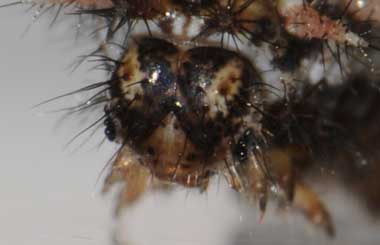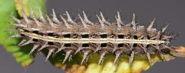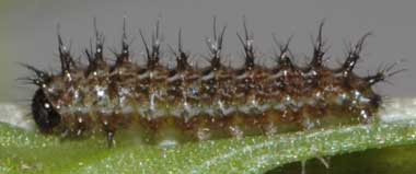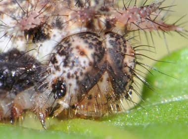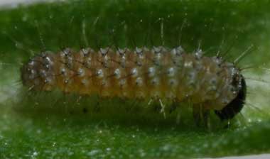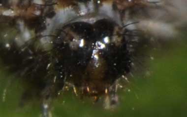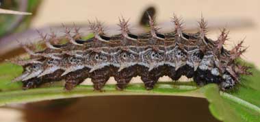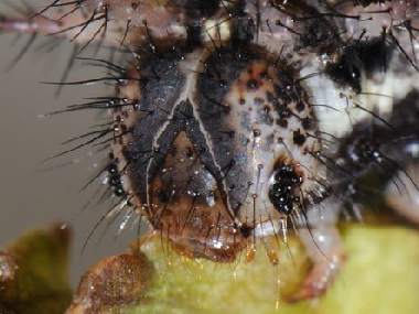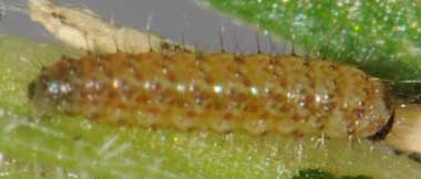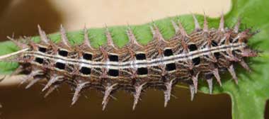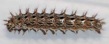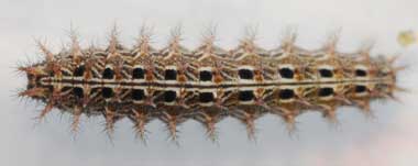 (参考) 脱皮後成長したウラギンスジヒョウモンの幼虫(3齢、7.2mm、スミレ) 2014年11月5日 撮影 静岡市駿河区 飼育 富士山麓の高原 産 個体1。ここまで成長すると、背中や頭部の模様もはっきり分かります。頭部にはすこし白い模様が見えます。 トップページへ |