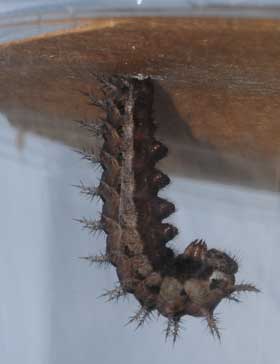 (参考) 脱皮後成長したウラギンスジヒョウモンの幼虫(6齢、31mm、スミレ)と飼育の様子 2014年11月22日 撮影 静岡市駿河区 飼育 富士山麓の高原 産 個体1。脱皮は11月17日でした。23℃ぐらいの加温した飼育容器で飼っていますが成長が遅くなった気がします。脱皮ごとに色味が少しずつ変化しています。 トップページへ |