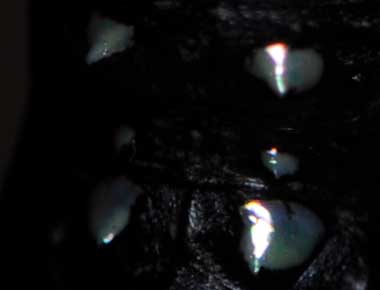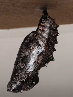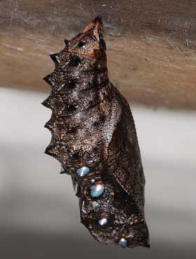 (参考) ウラギンスジヒョウモンの蛹(24mm)と輝く突起 2014年11月27日 撮影 静岡市駿河区 飼育 富士山麓の高原 産 個体2。前蛹になって1.5日ほどで蛹化しました。オオウラギンスジヒョウモンとほとんど同じ形状です。突起はやはり銀色に輝いていますが、その感じを写すのは難しいです。 トップページへ |