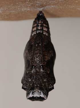 (参考) ウラギンスジヒョウモンの前蛹 2014年11月26日 撮影 静岡市駿河区 飼育 富士山麓の高原 産 個体2。容器のふたの裏に、吐糸のため厚紙を両面テープで張り付けておいたところ、首尾よくそこで前蛹になってくれました。 トップページへ |