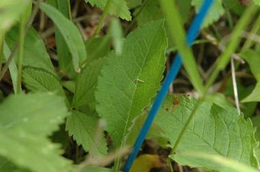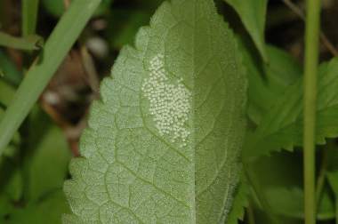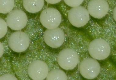 (参考) ウスイロヒョウモンモドキの卵(オミナエシ) 2005年7月10日 兵庫県ハチ高原 すでに見つけられていた卵を見せてもらいました。白い筋のある卵が整然と並べられて、オミナエシの葉裏に産み付けられていました。 トップページへ |