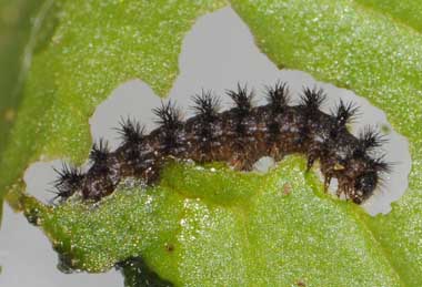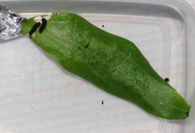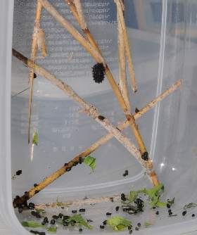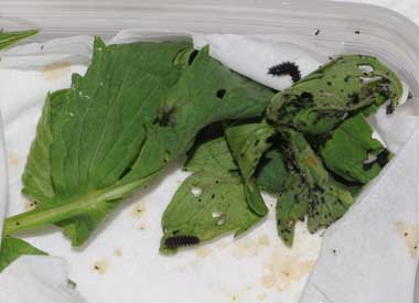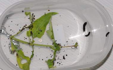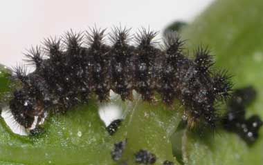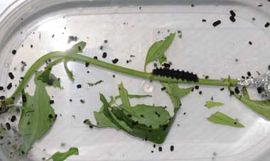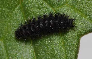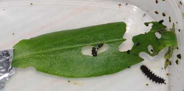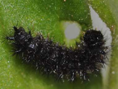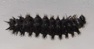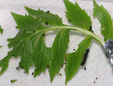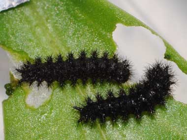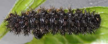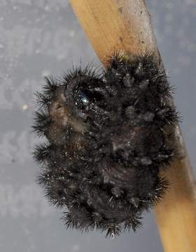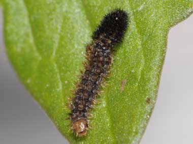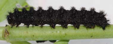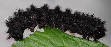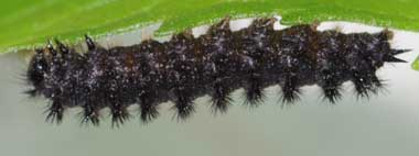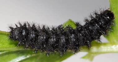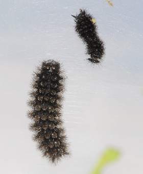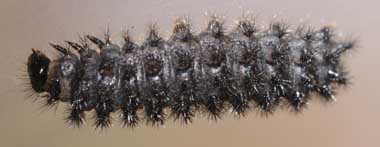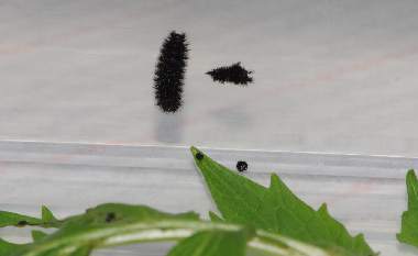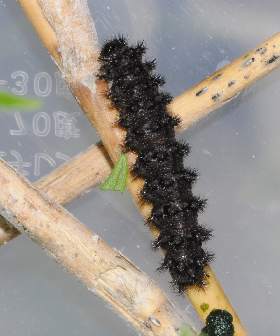 (参考) 脱皮後成長した幼虫(7齢、13.0mm、西洋カノコソウ) 2014年6月13日 撮影 兵庫県神河町産累代飼育個体 静岡県駿河区 飼育 個体1:脱皮して成長しても黒い毛虫のままです。 トップページへ |
