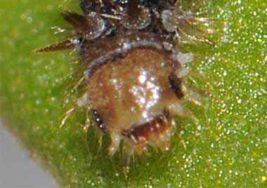 (参考) | 脱皮後間もない幼虫(7齢?、11.3mm、ベニカノコソウ)と頭部 2014年6月11日 撮影 兵庫県神河町産累代飼育個体 静岡県駿河区 飼育 個体5:容器の壁面で脱皮しました。あいかわらず体全体が黒いです。