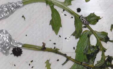 (参考) ウスイロヒョウモンモドキの幼虫(5齢?、4.7mm、カノコソウ?) 2014年5月24日 撮影 兵庫県神河町産累代飼育個体 静岡県駿河区 飼育 ウスイロヒョウモンモドキは4齢で越冬すると言われています。入手した時期から考えてこの個体はおそらく越冬後1度脱皮したものだろうと推定しています。カノコソウと思われる葉を食べている状態で入手しました。カノコソウは持っておらず、睡眠誘導作用ハーブとして知らる西洋カノコソウ(Valeriana officinalis )およびカノコソウ属に近縁の鑑賞用の白い花のベニカノコソウ(Centranthus ruber )を用いて飼育を始めました。ペルチェ式の冷温箱にタッパーを入れて飼っています。24℃ぐらいです。 トップページへ |