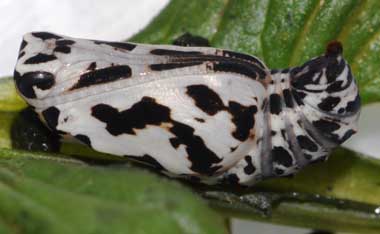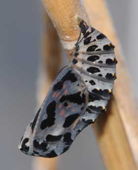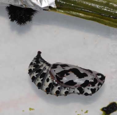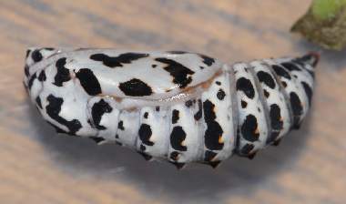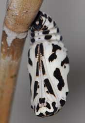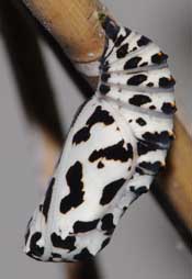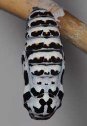 (参考) ↑ウスイロヒョウモンモドキの蛹(12.9mm、西洋カノコソウ) 2014年6月30日 撮影 兵庫県神河町産累代飼育個体 静岡県駿河区 飼育 個体1:6月27日には蛹化しました。幼虫の姿とは全く異なる白黒の模様です。こうやって写真を撮ると目立った感じですが、アフリカのシマウマと同じように、自然の中では敵から見づらいのかもしれません。もっとも、シマウマの模様の意味(あるとしたらですが)も定説はないようです。 トップページへ |
